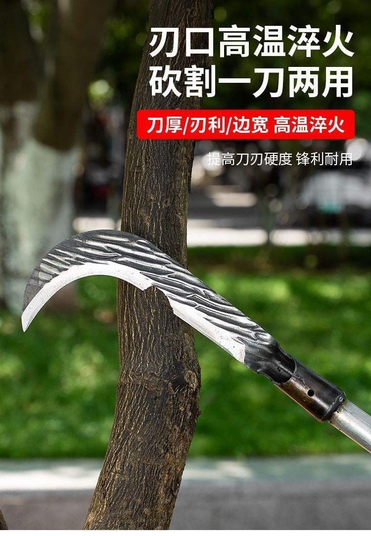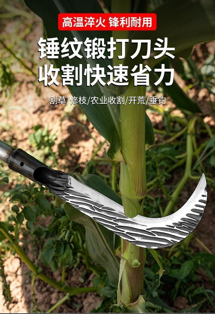 This long-handled sickle, forged from high-manganese steel, is an efficient tool for agricultural harvesting, garden pruning, and outdoor land clearing, offering both durability and practicality.