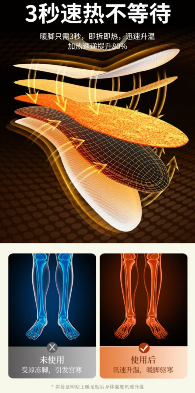 Fast-heating and long-lasting warmth! Heats up in just 3 seconds 🔥 , instantly warms up upon opening, warming your feet instantly – faster than drinking hot water! 12-hour constant temperature operation ⌛ , honeycomb structure locks in warmth layer by layer, keeping you warm from 8 am to the end of the workday – stay cozy all day long! Full-foot heating 👣 , with a 90% increase in surrounding heating area, even your toes are warm, eliminating the embarrassment of "half-cold" feet!