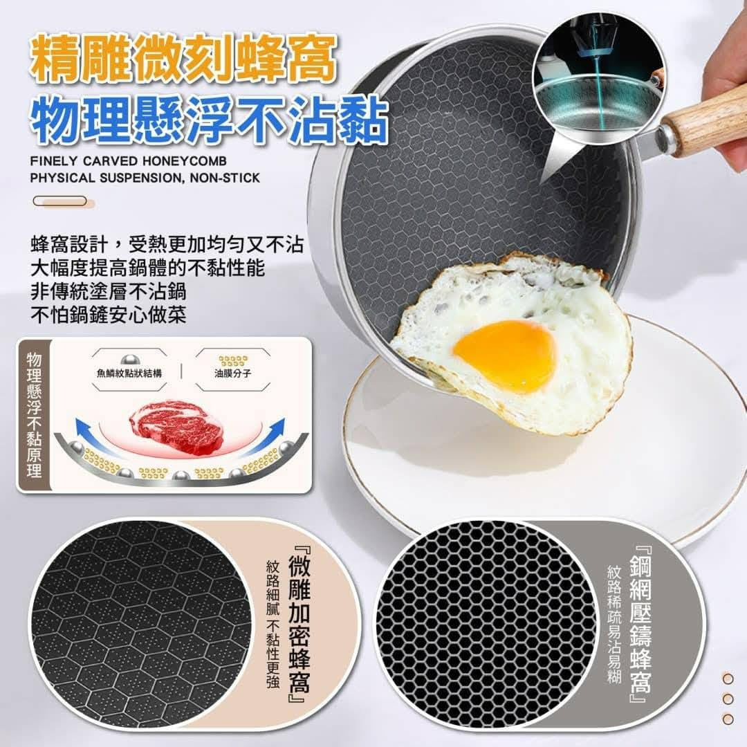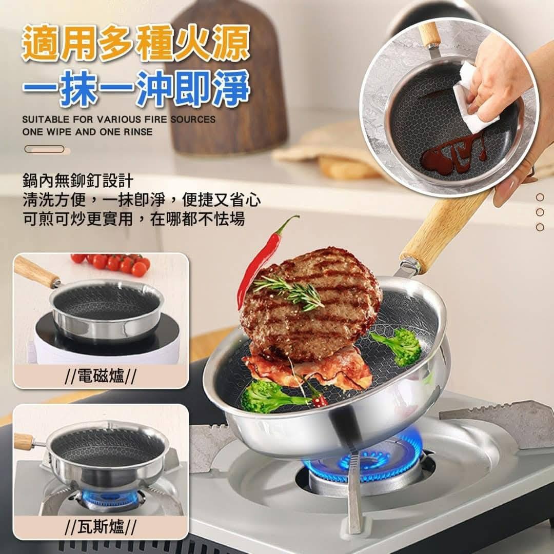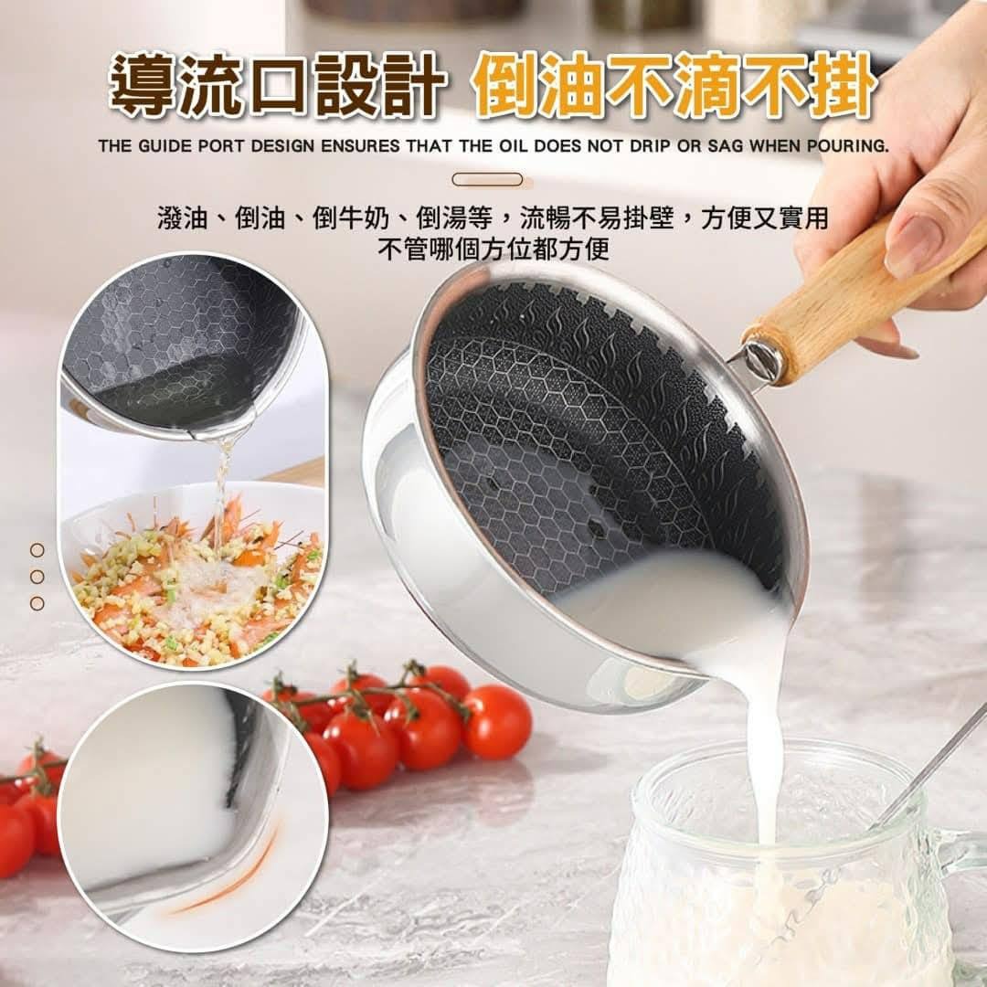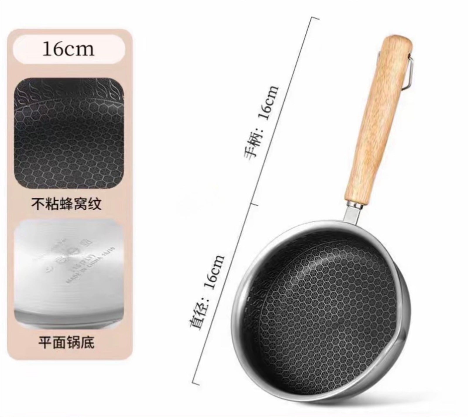 The non-stick coating on this pan is amazing! Egg pancakes don't stick to the bottom, flipping them is incredibly smooth, and they come out perfectly intact without breaking. 🫕 The food-grade stainless steel body is safe and odorless, making food contact with it worry-free. The solid wood handle is heat-resistant and non-slip, providing a comfortable grip. The thickened bottom design ensures even heat distribution, allowing for quick cooking over low heat, saving energy and time. The 16cm size is just right for 1-2 small wooden balls – not too many! It's also great for everyday use, like frying sausages, poaching eggs, and making egg dumplings – incredibly versatile!
