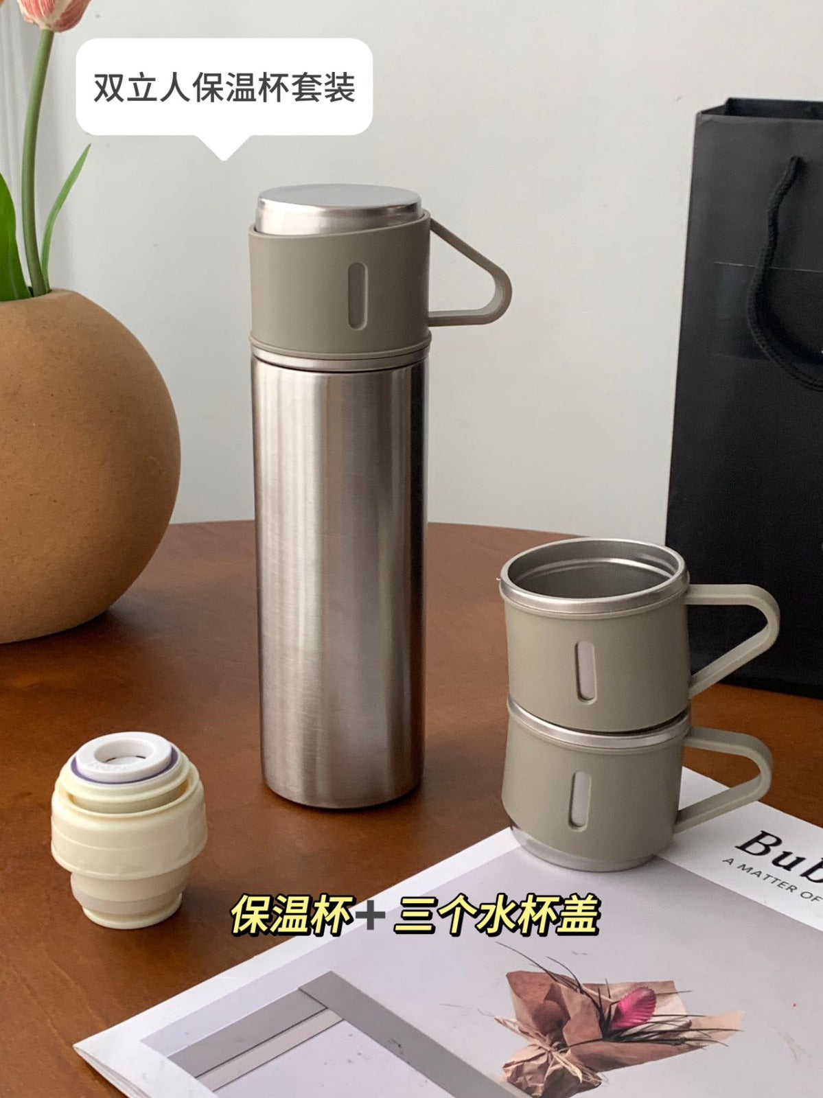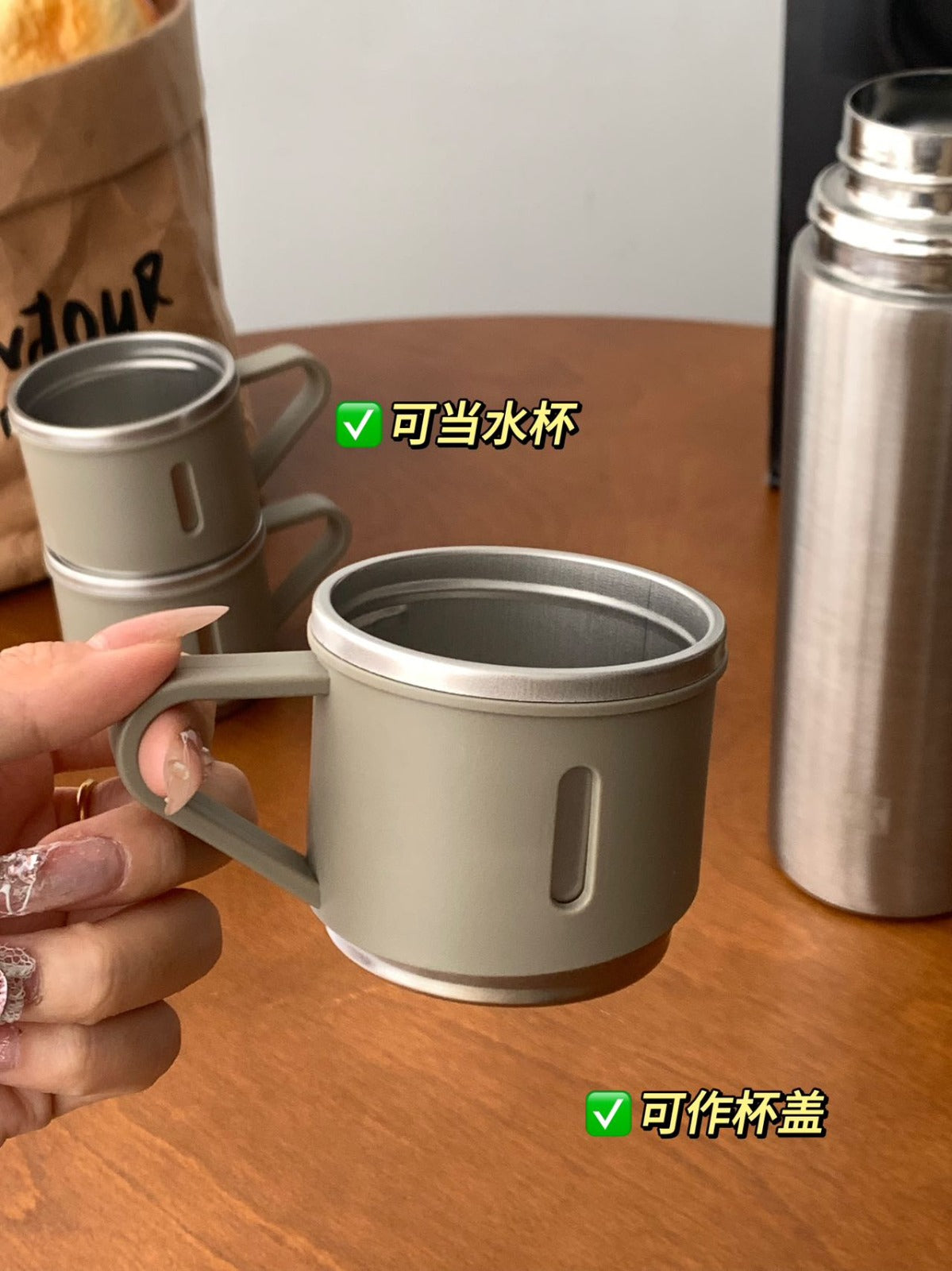 The wide mouth design makes it super easy to clean! With a large 500ml capacity, it keeps drinks hot or cold, making it incredibly convenient to carry around 🍃 . Plus , it comes with 3 small cups ✌️ , which can be used as lids to share with family and friends anytime, anywhere ✌ .