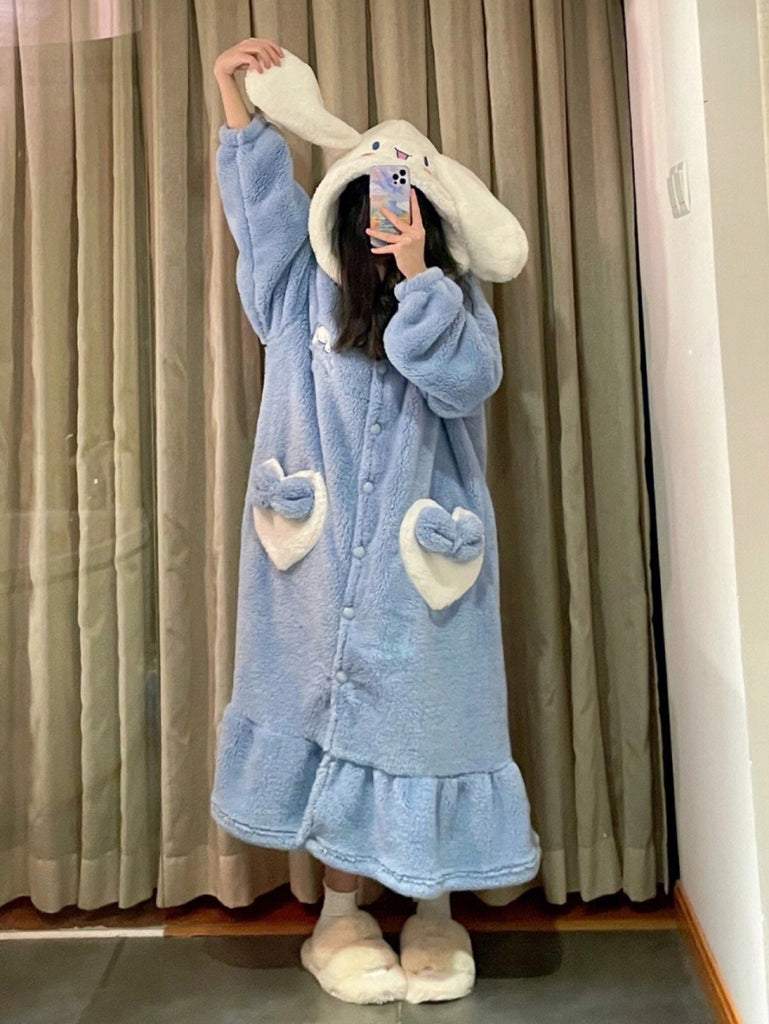 Made of thick coral fleece, it's soft and fuzzy, and feels like being wrapped in a cloud. ☁️ No more cold weather in winter, warm from head to toe. And its design is very thoughtful, with cuffs that fit snugly around your wrists, keeping the cold wind out. The lace hem reaches down to your calf, making it both cute and warm. It's the perfect "warm baby" for those who stay home.