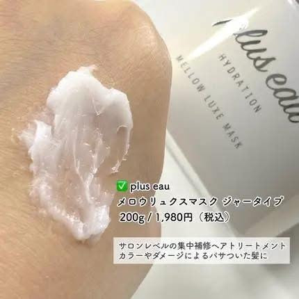 Plus Eau Intensive Repair Hair Mask's penetrating repair ingredients thoroughly repair damage caused by dyeing and perming, restoring flexibility to dry, damaged hair. It blends seamlessly with the skin, while the serum ingredients sodium hyaluronate and hydrolyzed collagen protect and increase moisture levels in the stratum corneum, leaving it feeling moisturized.