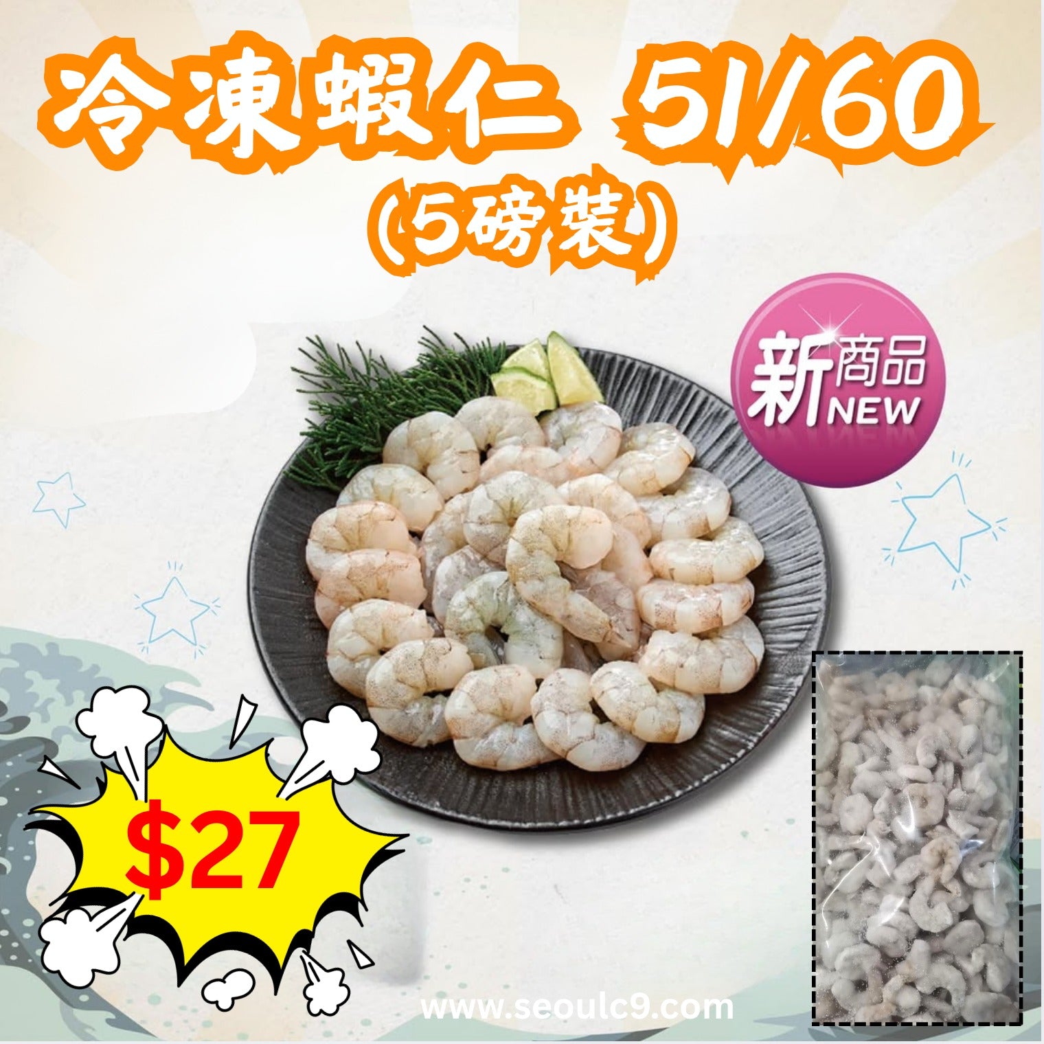Frozen shrimp, 51/60 (5 lbs set)