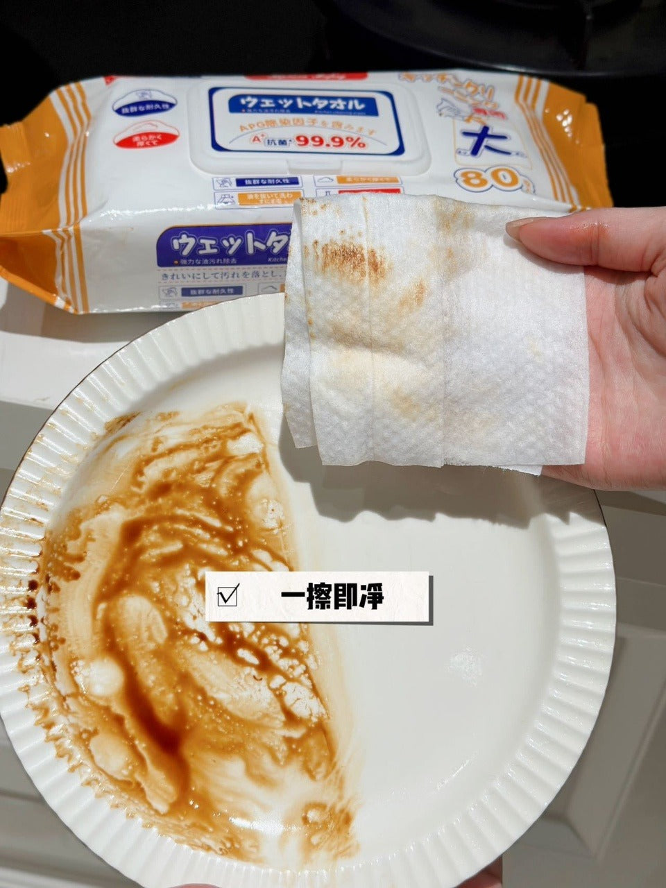 • 超大尺寸,覆蓋更廣單張濕紙巾和手臂一樣長,大面積油污一張搞定,不用反覆撕取,清潔效率翻倍👍