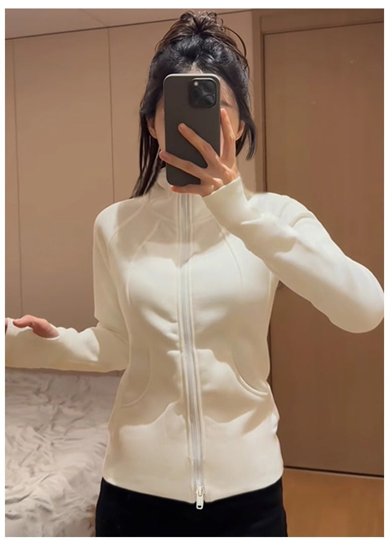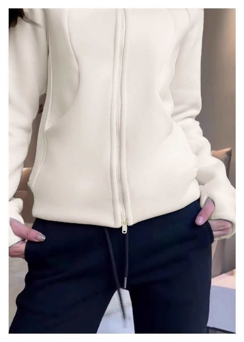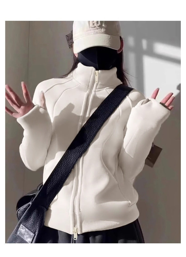Fleece-lined for warmth and soft against the skin 😌 , this polyester and spandex blend fabric features a fleece lining to lock in warmth, offering a soft and skin-friendly feel, making it both warm and comfortable for autumn and winter wear. The slightly loose fit with a three-dimensional cut visually slims the waist, creating a defined waistline and effortlessly achieving a "wattage" effect. Double zipper pulls allow for adjustable opening, and finger holes secure the cuffs to prevent cold air from getting in—thoughtful details throughout.