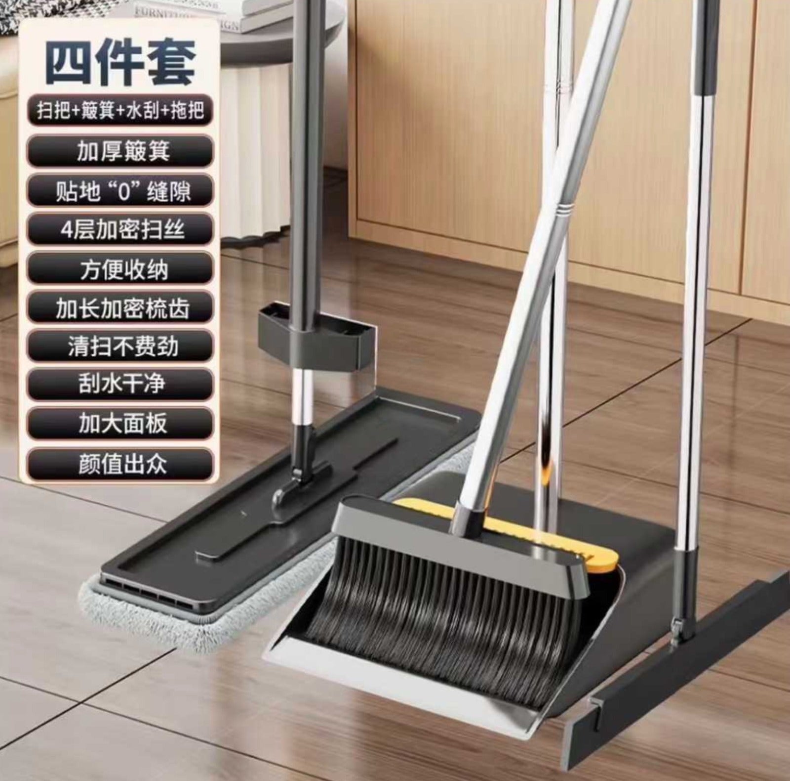 This four-piece set is a "lazy person's dream" for housework ! 👇 1️⃣ Broom + Dustpan: Sweeps away dust without raising dust, dense bristles + anti-dust design catches all hair and debris, preventing dust from leaking out along the way~ 2️⃣ Squeegee + Mop: Dual benefits for both wet and dry use, the squeegee absorbs liquid stains, and the mop uses electrostatic adsorption to attract fine dust. The 42cm wide flat surface allows for 3⃣ stops with three strokes of the squeegee , and 8...