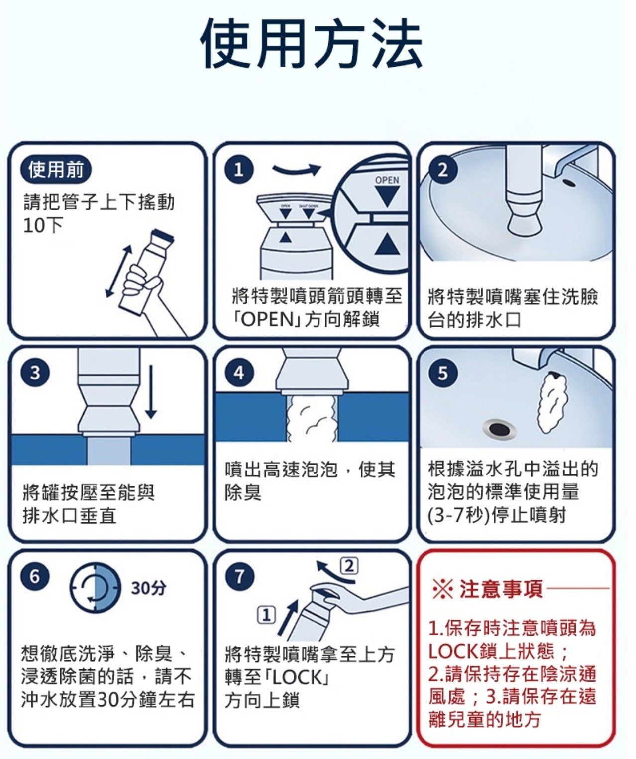 4. Spray: Press the can to spray high-speed bubbles. Spray for 3-7 seconds, depending on the amount of bubbles produced by the overflow hole.