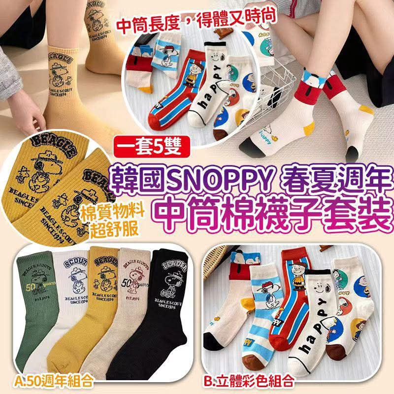 韓系 Snoppy 春夏週年 中筒棉襪子 (一套 5對)