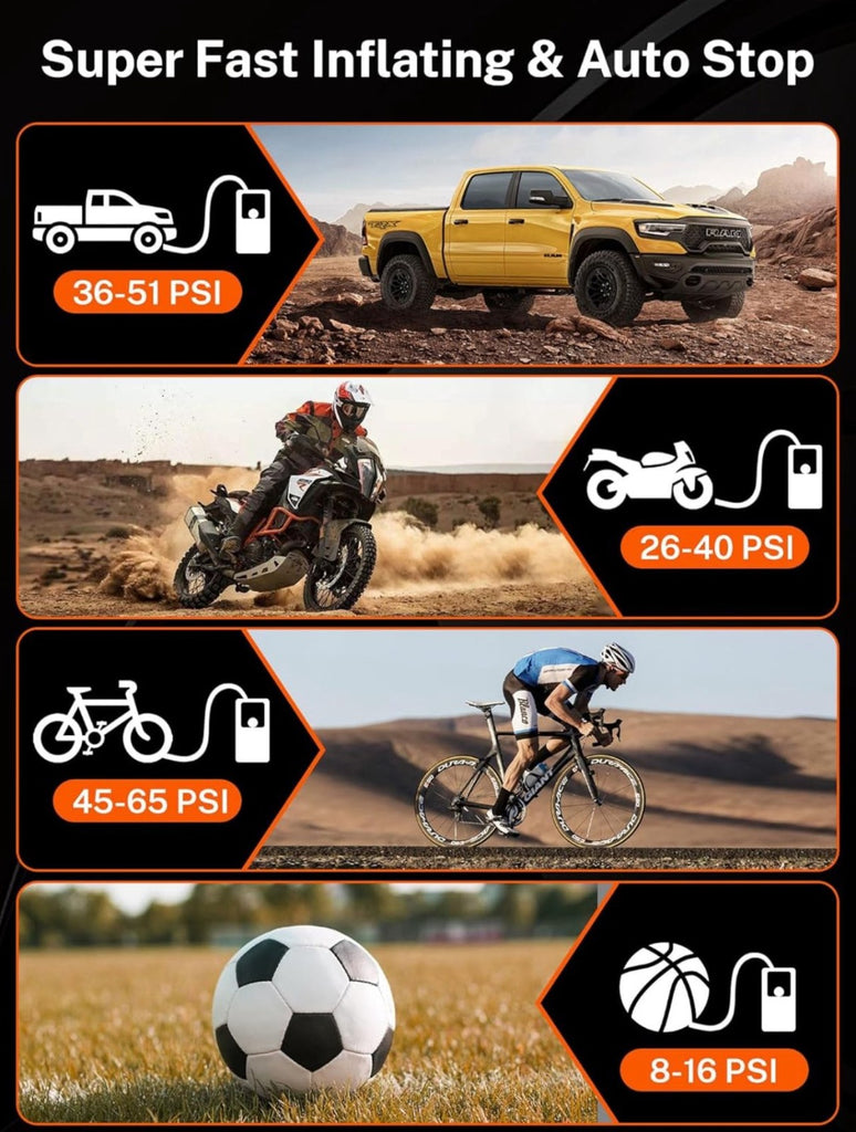 🌟High -speed inflation: Powerful 150 PSI capacity, 4 times faster than traditional pumps! 🚗For long-distance travel or daily maintenance, quickly inflate tires, bicycles, motorcycles, and more to ensure safety and comfort! 🛣️Digital pressure gauge accurately monitors and automatically shuts down to prevent overcharging! ✅
