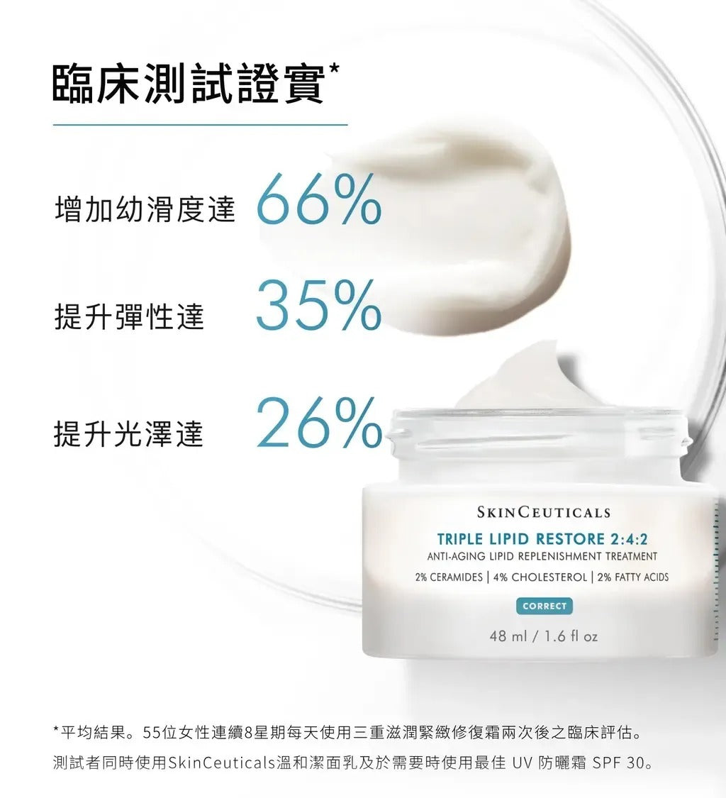 The 2:4:2 Triple Moisturizing and Firming Repair Cream is the first anti-aging cream formulated with a 2:4:2 cholesterol ratio. This product contains the highest concentration of pure lipids that can penetrate the skin, effectively replenishing lost lipids.