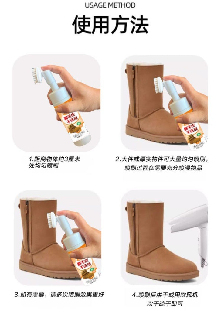 乾刷設計!不用沾水就能帶走灰塵、泥漬、油污,避免翻毛纖維結塊變硬!護理劑含軟化因子,刷頭輕柔梳理絨毛,刷完鞋子像剛買的一樣蓬鬆有質感!清洗後會在絨毛表面形成防護膜,減少後續沾灰、沾油,髒得更慢,延長鞋子壽命